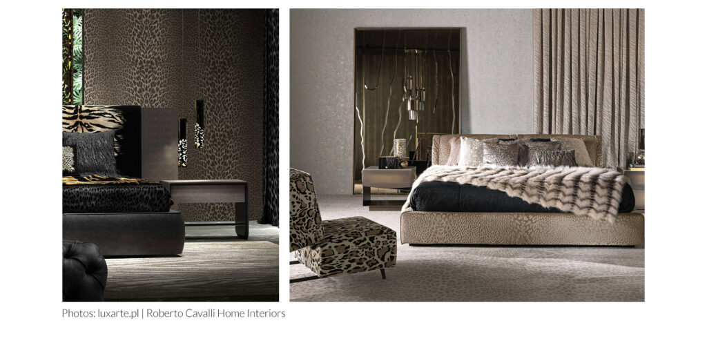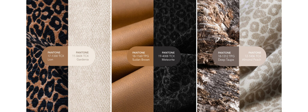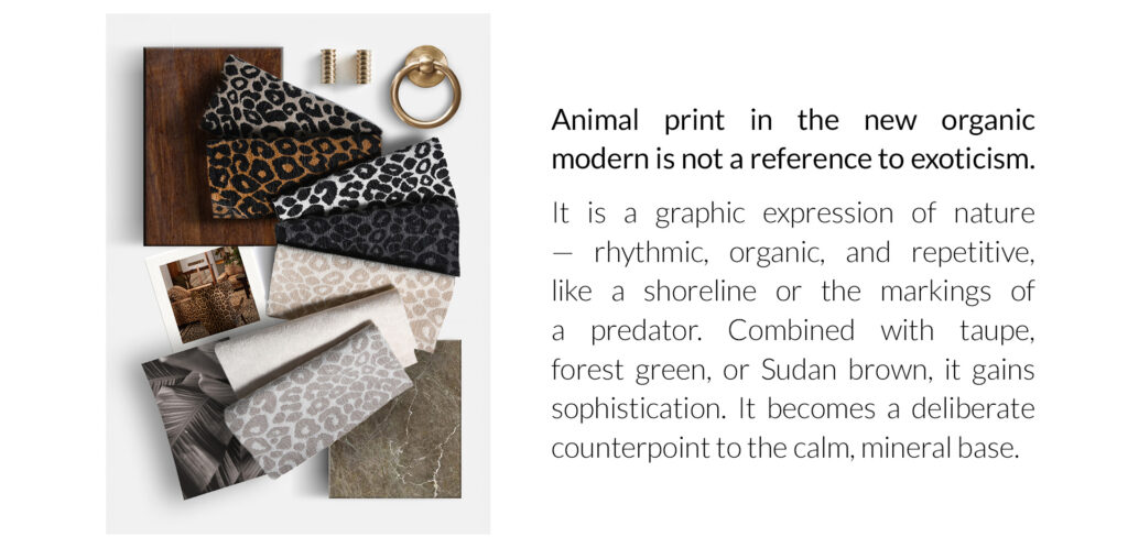 In the new version of organic modern, animal print is no longer an exotic reference. It becomes a graphic expression of nature — rhythmic, organic, repetitive like a shoreline or a predator’s spots. Combined with taupe, forest green, or Sudan brown, it gains refinement and becomes a conscious counterpoint to the calm, mineral base.