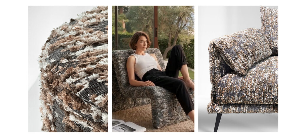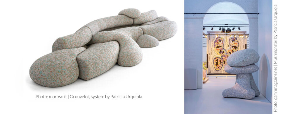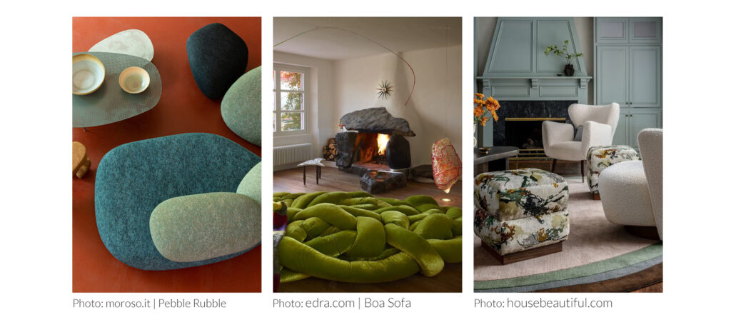 The biomorphic forms of Moroso or Urquiola’s installations are only a preview of a broader shift: furniture is no longer geometric, and fabrics are no longer flat.