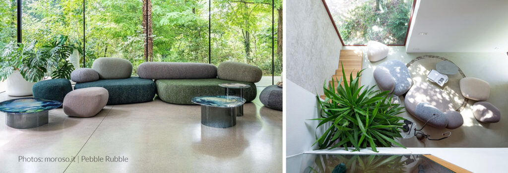 The same idea appears in projects such as Pebble Rubble by Front Design for Moroso — forms resembling stones smoothed by time. Asymmetrical, massive, yet surprisingly soft. These are no longer just pieces of furniture — they are landscapes.