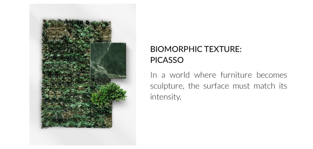 In a world where furniture form becomes sculpture, the surface must match it in intensity.