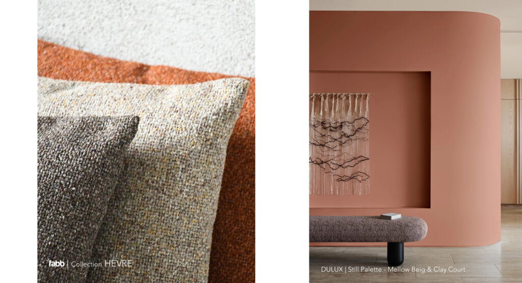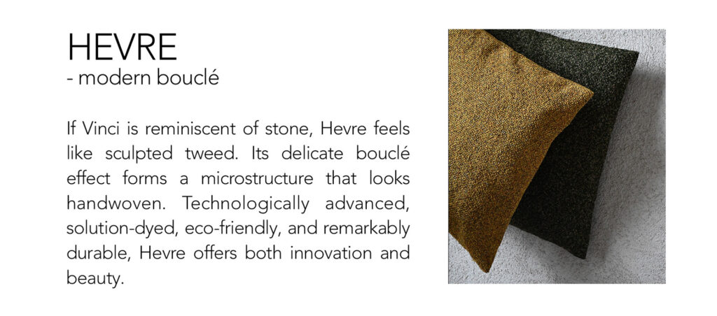 Hevre pairs beautifully with velvets (Bluvel, Mavel), creating an effect of contemporary luxury that doesn’t rely on shine.