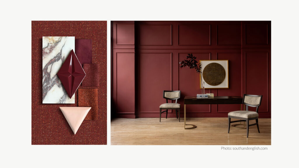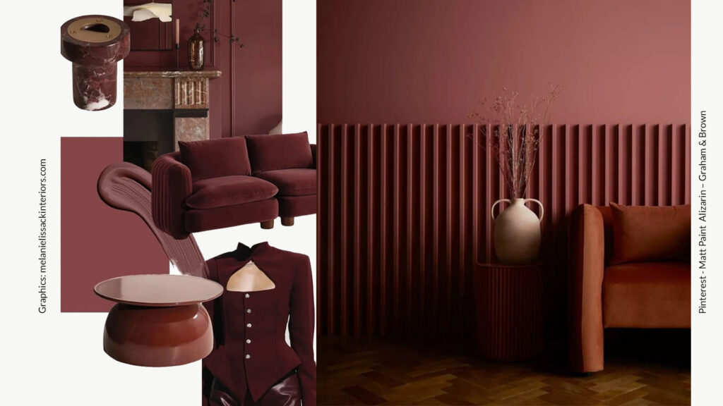 - Scandinavian brands such as Bolia and Woud increasingly use shades of burgundy, bordeaux and deep red in their ranges, giving furniture a distinctive and elegant accent.