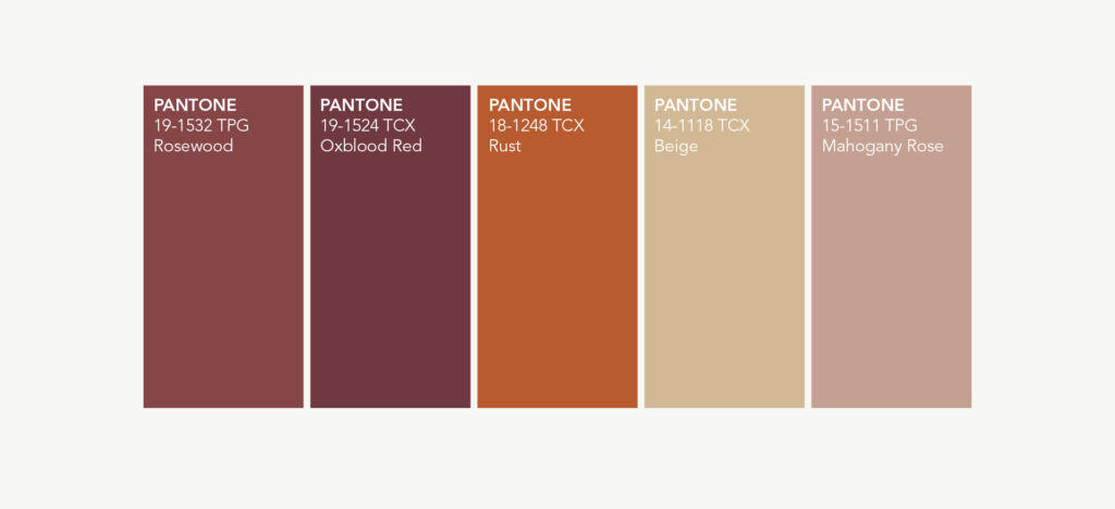 - Pantone 15-1511 TPG Mahogany Rose – a muted warm pink with a hint of brown. It connects burgundy with terracotta, adding softness and a subtle suede-like effect to the palette.