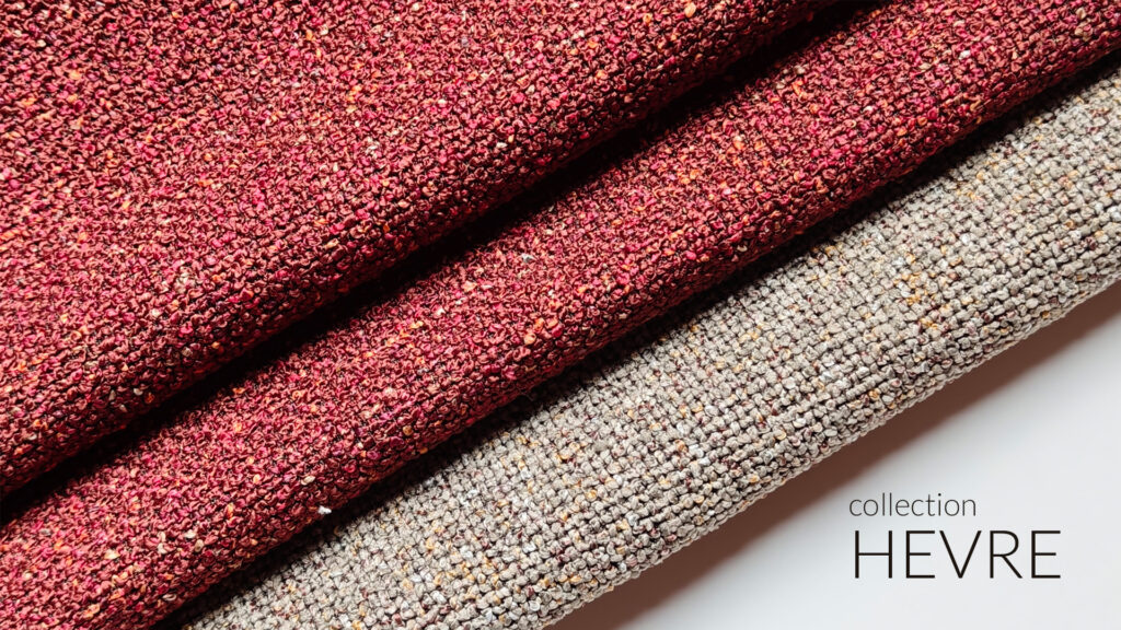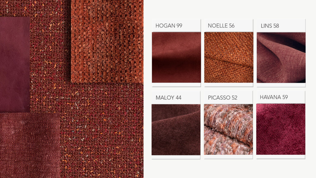 Contemporary design trends show a clear shift toward warm, spice-inspired tones: sienna, mineral reds, burgundies with brown undertones, and colours inspired by ceramics and natural pigments. Hevre brings these tones together in a structural mélange, while terracotta Noelle softens the composition alongside the cherry-toned suede of Hogan.