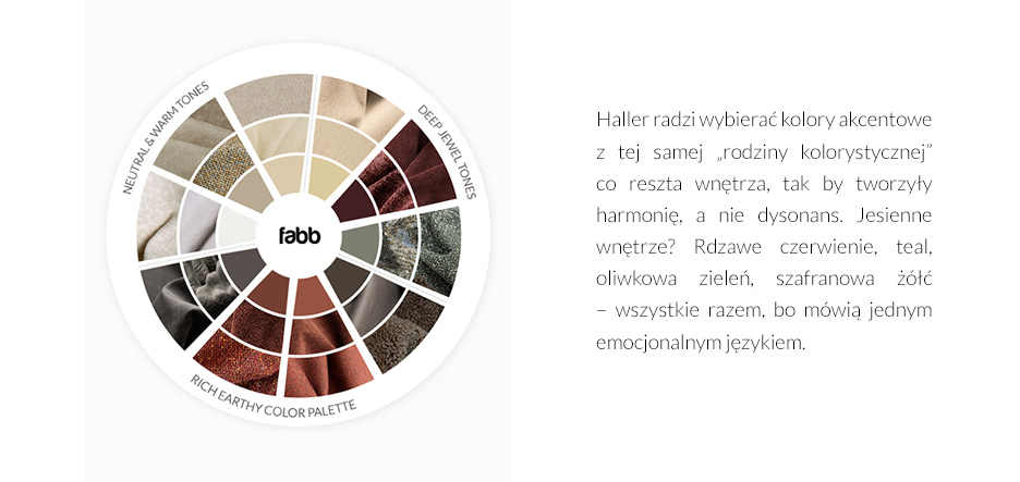 Haller opisuje ten mechanizm wprost: ludzie podświadomie wybierają kolory zgodne z emocjami, których aktualnie potrzebują, albo tymi, które dominują w ich psychice. Osoby w fazie przejściowej, szukające spokoju, sięgają po zieleń szałwii i ciepłe szarości. Ci w ekspansywnym, twórczym momencie życia po głęboki szmaragd, rdzawy pomarańcz, żółć ochry.