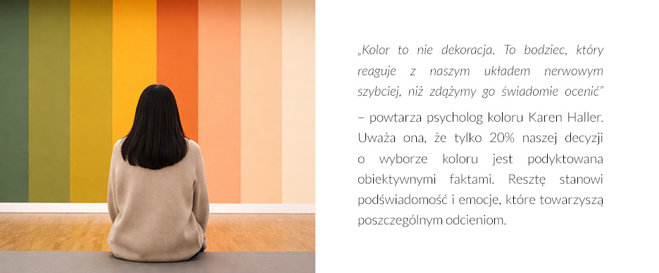 „Kolory widzimy oczami, ale prawdziwa magia dzieje się w mózgu” – mówi wspomniana wcześniej Karen Haller, jedna z czołowych światowych ekspertek w dziedzinie behawioralnej psychologii koloru i autorka The Little Book of Colour. „Gdy kolor zostaje przetworzony, wyzwala emocjonalną i fizjologiczną odpowiedź, która zmienia to, jak się czujemy i jak się zachowujemy.”