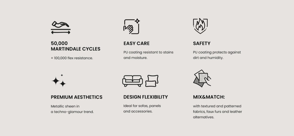 In accessories – cushions, curtains, wall panels – the metallic texture of Atomic works like jewelry in an interior: it doesn’t dominate, but it draws the eye.