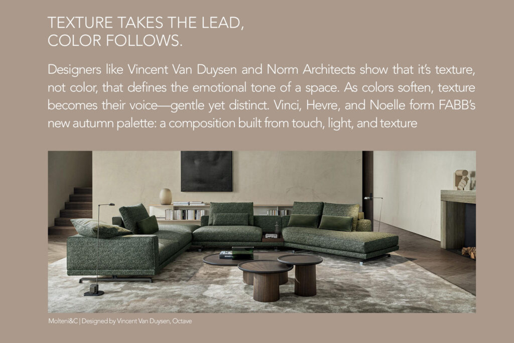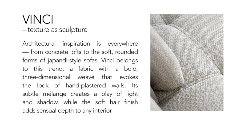 Within this landscape of colors, a special role is played by textural fabrics with pronounced weaves, reliefs, and soft piles.