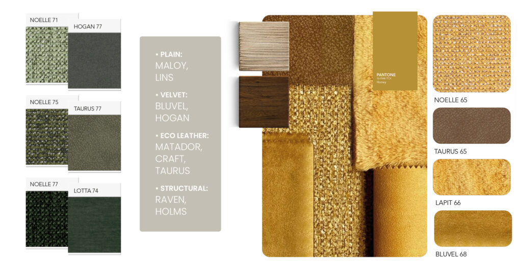 NOELLE upholstery fabric – green and grey palette, structural texture, resistant to intensive use.