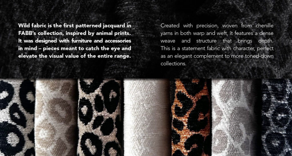 In today’s world, interiors increasingly become personal stories, where materials do more than decorate – they define space. FABB debuts with a fabric that blends the power of pattern with the highest quality craftsmanship. WILD is the brand’s first jacquard collection, featuring a bold, woven animal motif designed for those who seek courage in design without sacrificing class and comfort.