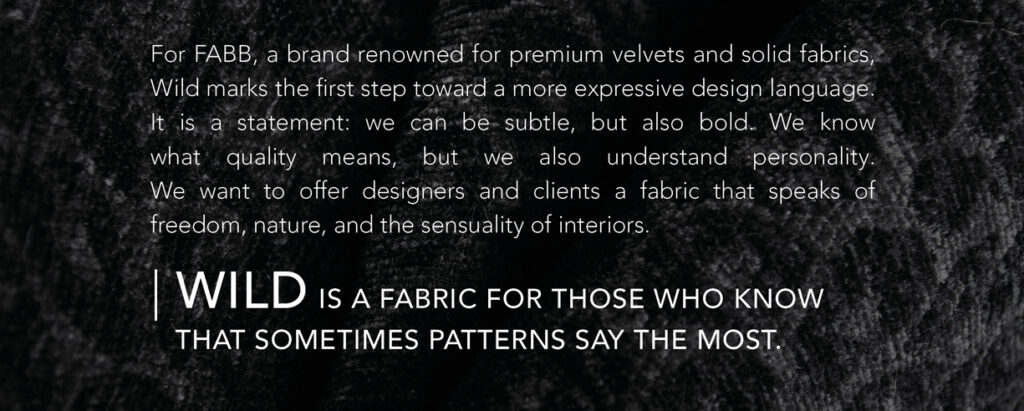 For FABB, a brand known for high-quality velvets and solids, WILD marks the first step into more expressive design. It is a manifesto: we can be subtle, but also bold. We know what quality means, but we also know what personality is. We want to give designers and clients a fabric that tells a story – of freedom, nature, and sensual interiors.